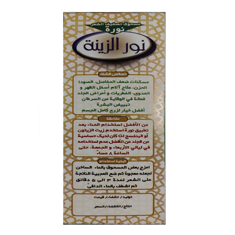 نور الزینه باعث بر طرف شدن سستی بدن ، درمان کمر درد و عفونت ، پیشگیری از ابتلا به سرطان ، سفید کننده پوست و ضد قارچ میباشد.