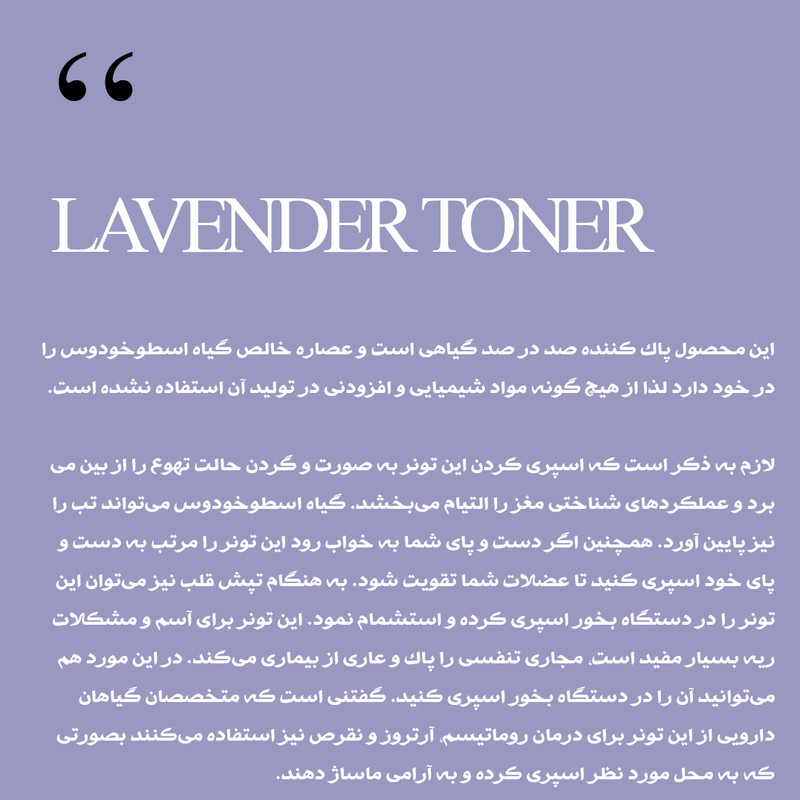 راهنمای استفاده : پس از استحمام یا شستشوی صورت تونر را بر روی پوست و یا بدن اسپری کرده و اجازه دهید تا خشک شود.