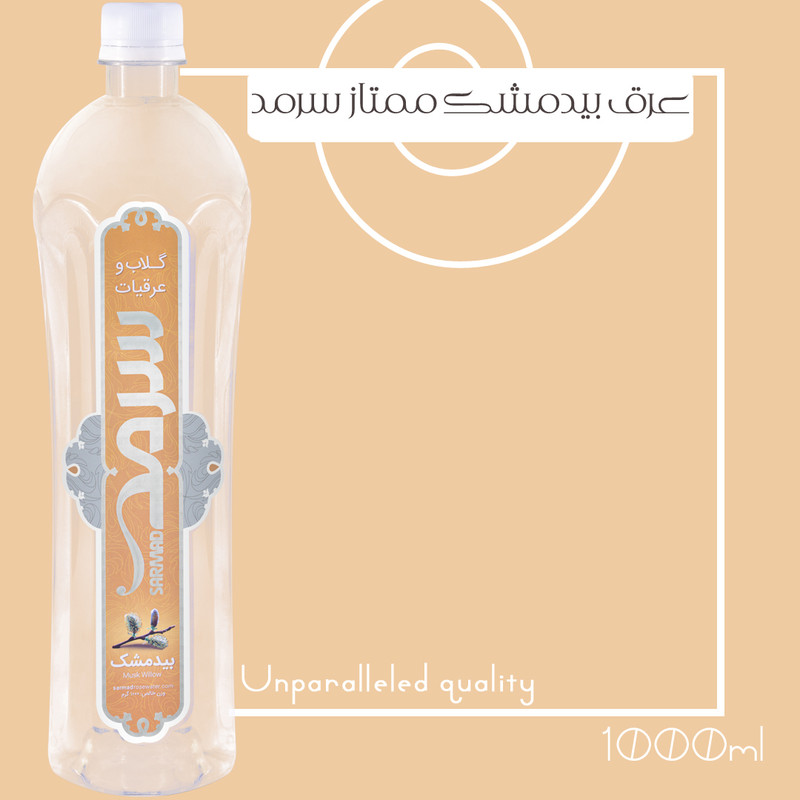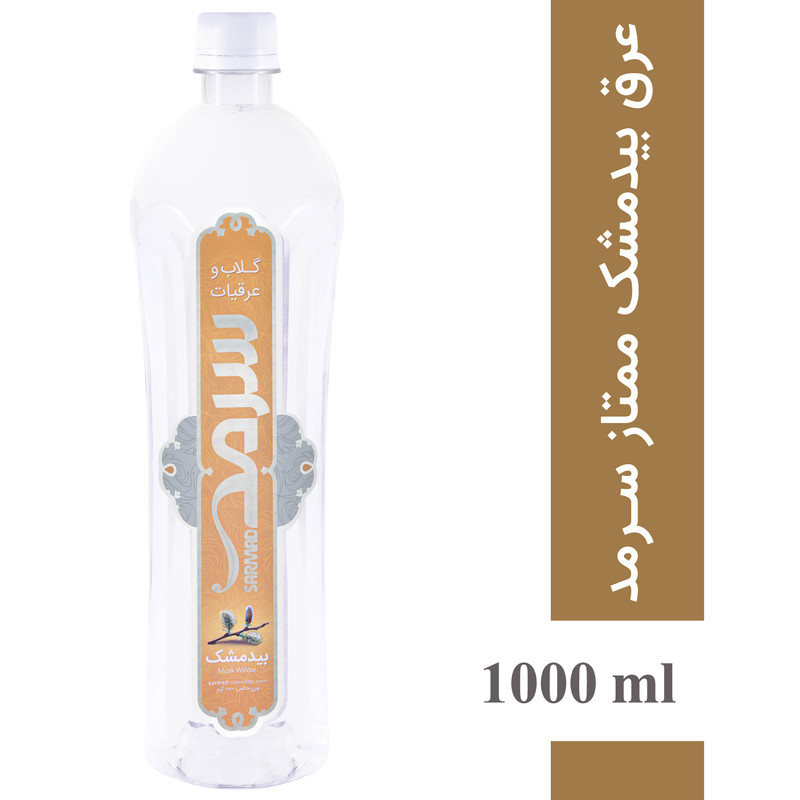عرق بیدمشک سرمد داخل پت بهداشتی شفاف با حجم 1000 میلی لیتر در بسته بندی بسیار شکیل محصول قمصر کاشان است.