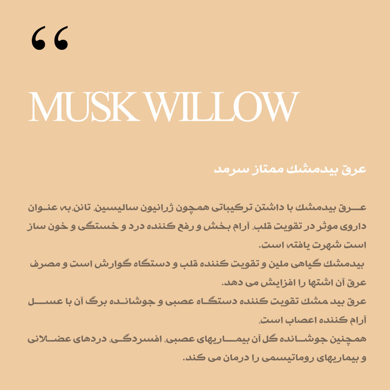 عرق بیدمشک سرمد دارای طبیعت سرد و تر می باشد موجب تقویت قلب و مغز است مخصوصا اگر با سیب قرمز مصرف شود .